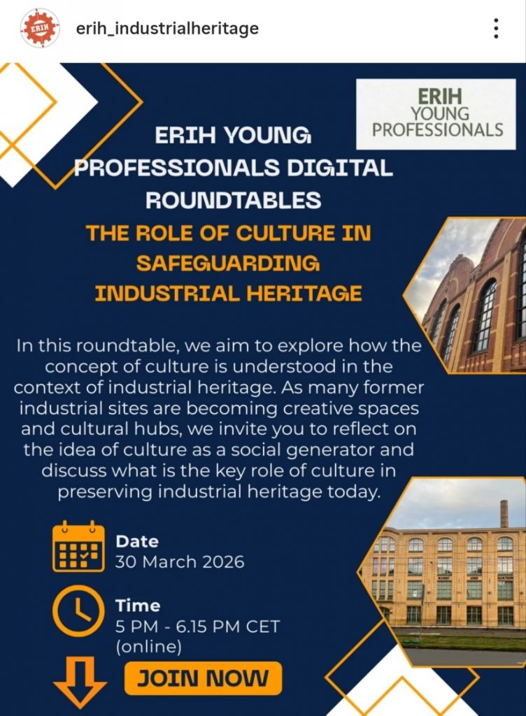 U ponedjeljak 30. ožujka 2026. asistentica Lea Biličić moderirala je okrugli stol pod naslovom “The Role of Culture in Safeguarding Industrial Heritage” koji se održao online u okviru međunarodne mreže Europske rute industrijske baštine (ERIH – European Route of Industrial Heritage). Okrugli stol organizirala je skupina ERIH Young Professionals koja aktivno djeluje u okviru mreže potičući uključenje studenata i mladih istraživača u interdisciplinarni dijalog o industrijskoj baštini. Petnaestak sudionika iz Njemačke, Nizozemske, Srbije, Rusije i Francuske razmijenilo je vlastita profesionalna iskustva u području industrijske baštine i raspravilo o tome kako se pojam kulture razumije u kontekstu industrijske baštine. Na temelju suvremenih primjera prenamjene industrijskih prostora u različite kreativne prostore, kulturne centre i druge ustanove namijenjene lokalnoj zajednici, sudionici su pružili vlastito viđenje kulture kao društvenog generatora te propitali koji akteri odlučuju o kulturnom sadržaju, koga on uključuje ili isključuje, koje su alternative takvom tipu postindustrijskih prenamjena i koja je ključna uloga kulture u očuvanju industrijske baštine danas. Kao jedan od primjera prenamjene istaknuta je aktualna transformacija bivše tvornice Paromlin u novu gradsku knjižnicu i društveno-kulturni centar u Zagrebu.