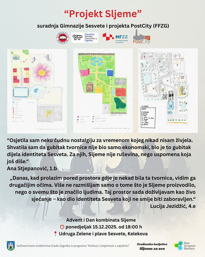 15. prosinca 2025. godine članice projektnog tima Nevena Škrbić Alempijević, Petra Kelemen i Lea Biličić sudjelovale su na cjelodnevnom događanju „Advent i Dan kombinata Sljeme“ u Sesvetama. U jutarnjim je satima projektni suradnik Bojan Mrđenović u tvorničkom kompleksu fotografirao bivše radnike Sljemena. Fotografiranje čini dio priprema za izložbu „Lica Sljemena“ koju suorganiziraju građanska inicijativa Sljeme za sve, Muzej Prigorja i PostCity projekt. Predvečer je u prostorima udruge Zelene i plave Sesvete organizirana tribina s tri prezentacije o tvornici Sljeme. Jedna od njih bila je posvećena „Projektu Sljeme“ koji su proveli učenici i nastavnice Gimnazije Sesvete u suradnji s PostCity projektom. Sudjelovanje na ovom sesvetskom događanju bila je prilika za prezentaciju PostCity projekta, za bilježenje različitih promišljanja o budućnosti Sljemena i za produbljivanje veza s lokalnom zajednicom.